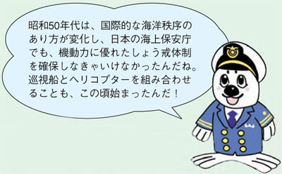 ▲独特の形状で人気者だったスカイバン ●昭和53年〜54年 新海洋秩序対応体制として大型飛行機YS-11A型3機が就役。ベル212型ヘリコプター10機が増強。また、ヘリコプター搭載型巡視船の建造計画が推進される。 ●昭和55年〜56年 SAR条約*1、国連海洋法条約の採択を背景とし、中型飛行機ビーチ200T型11機、ベル212型ヘリコプター10機増強。 ●昭和57年〜59年 中型飛行機ビーチ200T型2機、ベル212型ヘリコプター5機増強。 現代における活躍