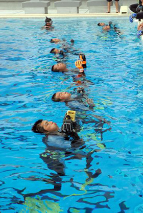 転覆した船舶からの救出等、潜水士として救難活動をするために必要な知識・技能を修得するための研修です。潜水士は、全国の巡視船艇乗組員の中から選抜され、海上保安大学校での厳しい訓練を経て、巡視船艇の潜水士、航空基地の機動救難士、特殊救難隊として活躍します。