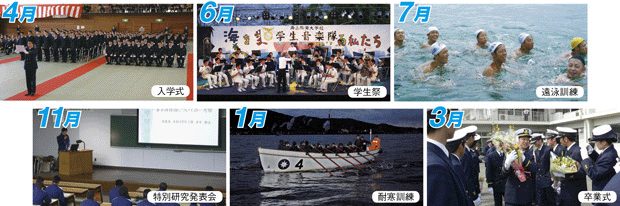 教育期間は本科4年、専攻科6か月及び研修科(国際業務課程)※6か月の合計5年間です。学生は本科4年間を通じて海上保安業務を遂行するために必要な 知識・技能を修得します。授業は、一般教養科目のほか、行政法、国際法、刑法などの法律関係や海上保安行政関係の学問を中心に行われ、また、2学年後期からは、第I群(航海)、第II群(機関)又は第III群(情報通信)のいずれかを選択し、船舶の運航に必要となる専門的な知識を修得します。