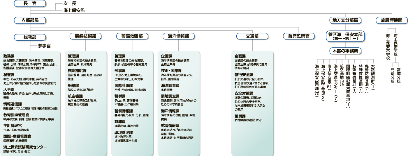 本庁には、長官の下に、内部部局として総務部、装備技術部、警備救難部、海洋情報部、交通部の5つの部を置いています。本庁は、基本的な政策の策定、法令の制定や改正、他省庁との調整などを実施しており、海上保安行政の「舵取り」役を担っています。 管区海上保安本部・海上保安部等