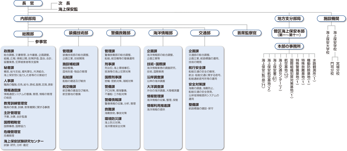 海上保安庁は、国土交通省の外局として設置されており、本庁(東京都)の下、日本全国に管区海上保安本部、海上保安部等を配置し、一元的な組織運用を行っています。