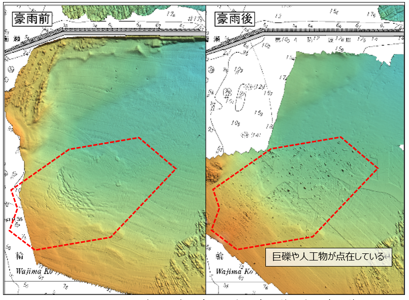 図6 河原田川の河口沖の豪雨前後の海底の様子(左:豪雨前、右:豪雨後)