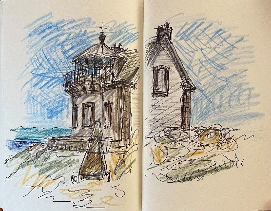 武石 尭(1937-)氏は茨城県大洗町出身の画家で灯台や寺院・仏像などを題材にした作品を多く制作しています。 高校教師を定年退職した後から日本の灯台巡りを実施し、日本の灯台を一通り回り終えた後、イギリス、フランス、アイルランドに遠征して灯台のスケッチを行いました。2014年の犬吠埼灯台140周年記念式典にて講演を実施しています。