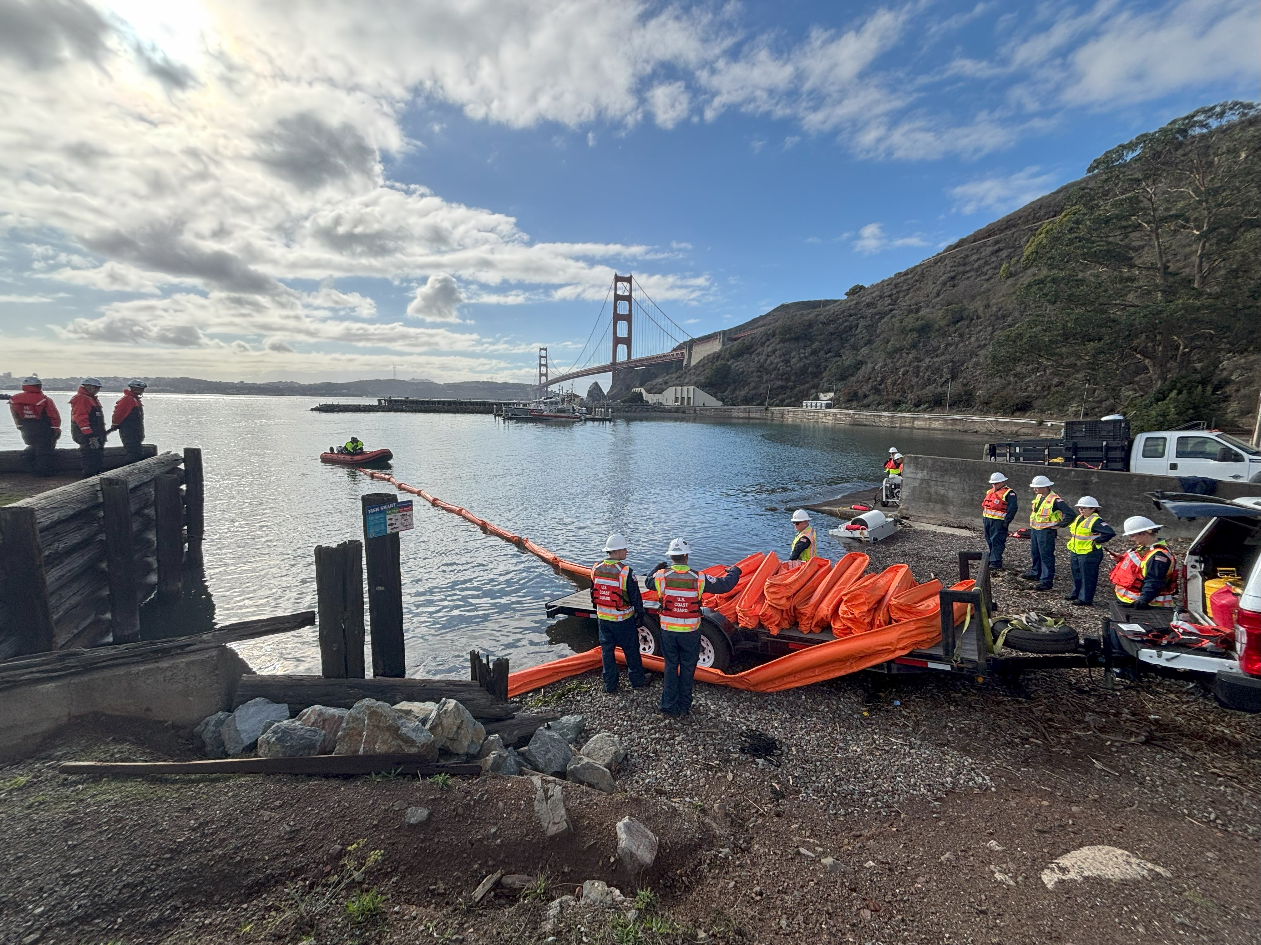 米国沿岸警備隊ゴールデンゲート基地でのオイルフェンス展張訓練