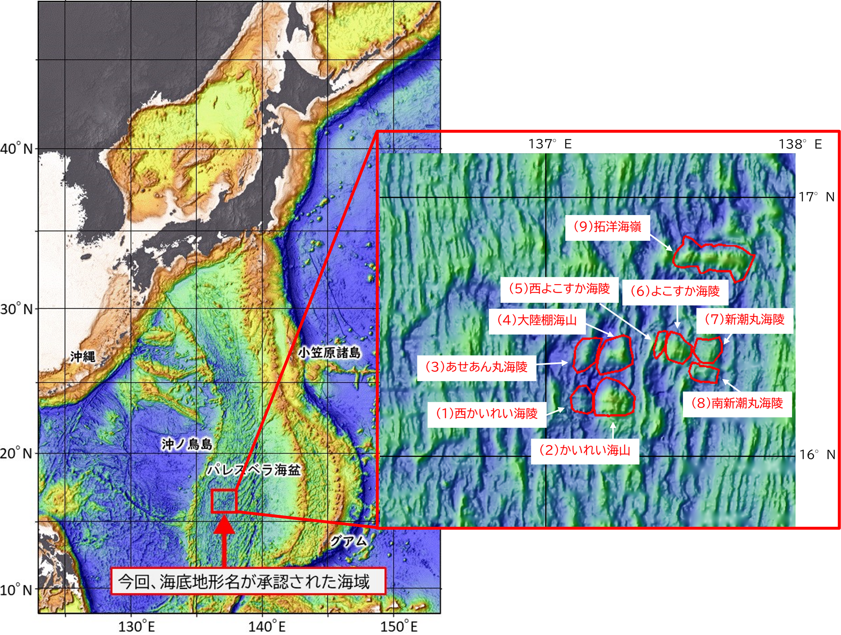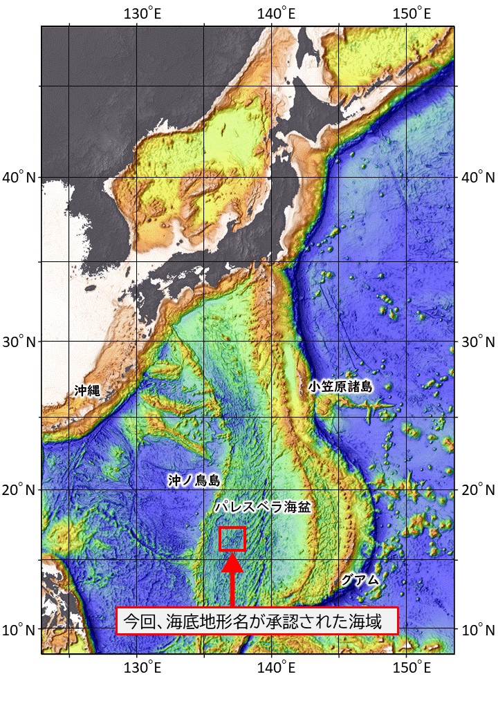 承認された名称は、沖ノ鳥島南南東約400kmのパレスベラ海盆にある海底地形(図1、図2)に付けられたもので、同海域の海洋調査を実施した我が国の海洋調査船の船名が由来となっています。(別紙参照)
