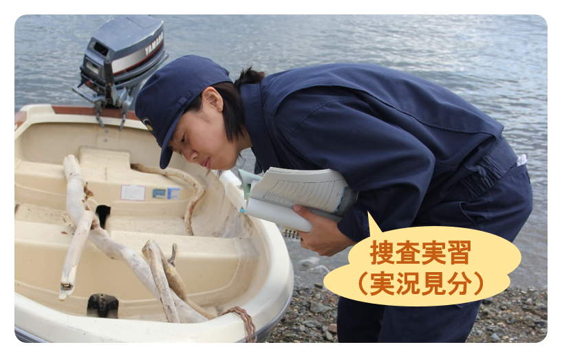 現場を再現した実習で、状況確認などの捜査方法を学びます。