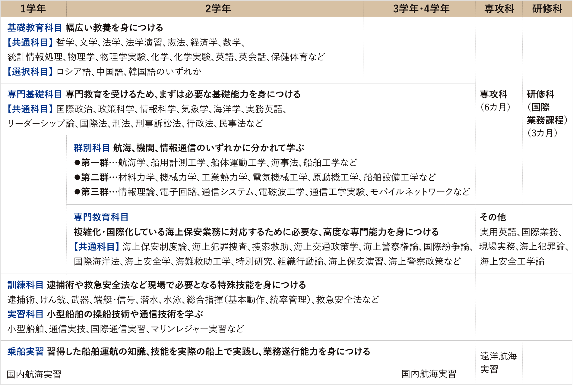 海上保安⼤学校は、将来、海上保安庁の幹部となる職員として必要な⾼度な学術‧技能を教授し、併せて⼼⾝の練成を図ることを⽬的として設置された海上保安庁の教育機関です。教育期間は本科4年、専攻科6ヵ⽉及び研修科(国際業務課程3ヵ⽉)の計4年9ヵ⽉間です。