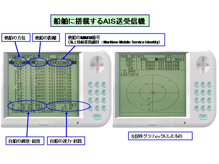 AISは、船舶の識別符号、種類、位置、針路、速力、航行状態及びその他の安全に関する情報を自動的にVHF帯電波で送受信し、船舶局相互間及び船舶局と陸上局の航行援助施設等との間で情報の交換を行うシステムです。 |